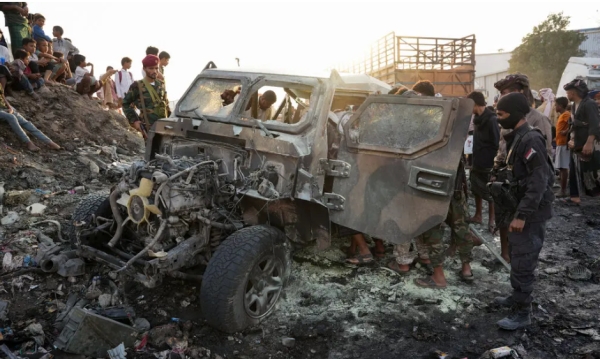 [ موقع هجوم سيارة مفخخة حديث في جنوب اليمن.الفضل...رويترز ]