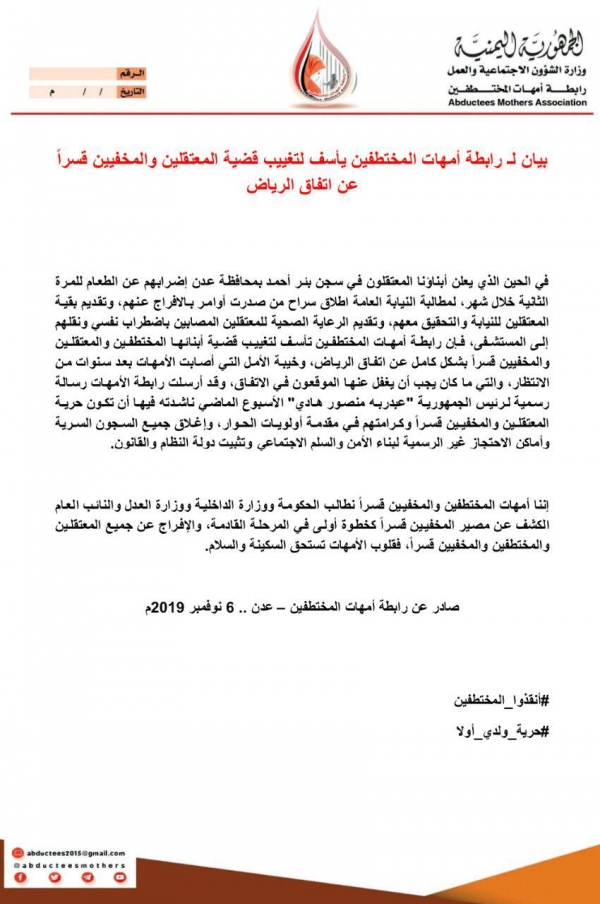 أعربت رابطة أمهات المختطفين بمحافظة عدن، اليوم الأربعاء، عن أسفها لتغيب قضية المختطفين والمخفيين قسرياً عن اتفاق الرياض.