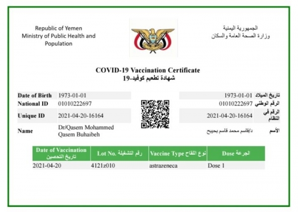 [ شهادت تطعيم لقاح كورونا في اليمن ]