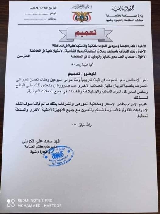 هدد مكتب التجارة والصناعة في محافظة شبوة (شرق اليمن) الإثنين، باتخاذ إجراءات صارمة بحق التجار الرافضين تخفيض أسعار السلع، بعد تحسن كبير للعملة المحلية التي تراجعت إلى 850 ريالا للدولار الواحد.