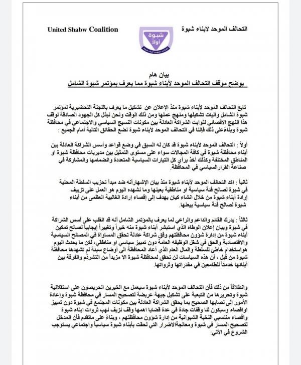 وعبر التحالف عن رفضه لمبدأ "تحزيب السلطة المحلية في شبوة لصالح فئة سياسية او مناطقية بعينها"، متهما القائمين على مؤتمر شبوة الشامل بتزييف إرادة أبناء شبوة من خلال انشاء كيان يهدف إلى إقصاء إرادة الغالبية العظمى من لصالح فئة سياسية.